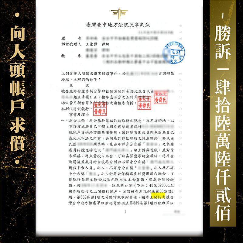 〚台北律師事務所〛向人頭帳戶求償「判賠46萬6仟2佰元」