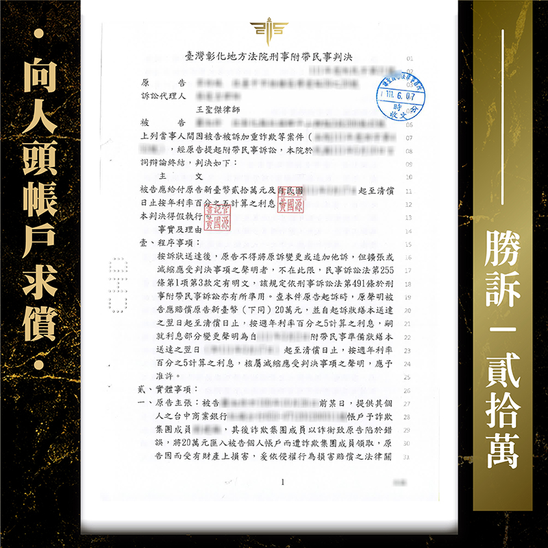 〚台北律師事務所推薦〛向人頭帳戶求償「判賠20萬元」