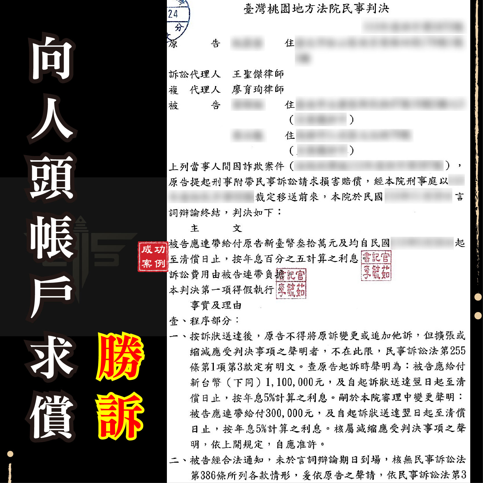 最終,在謙聖有效地答辯以及積極協助當事人蒐集有力的證據之下,成功替當事人拿回30萬元,求償成功!