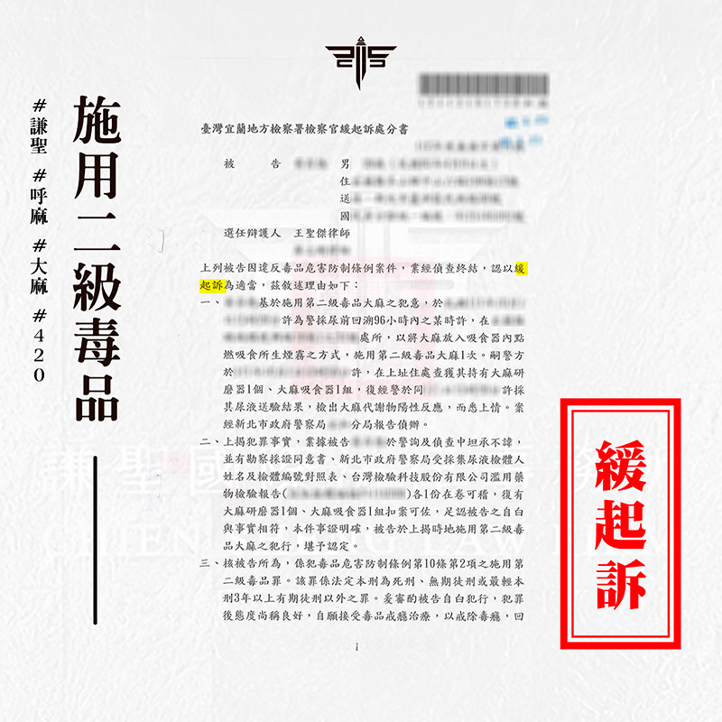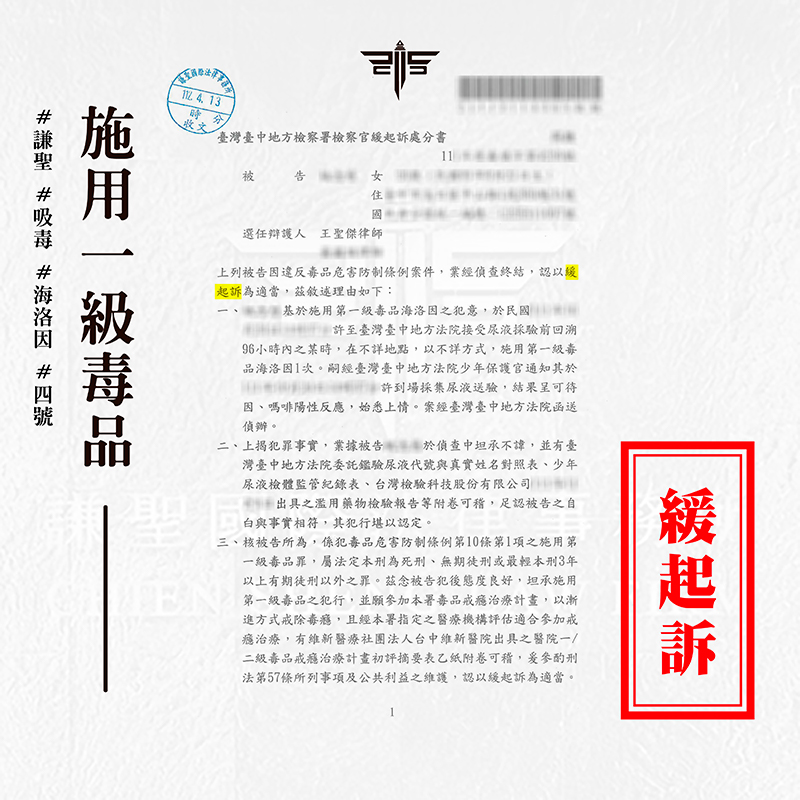 2024/03/18案情過程: 本案將介紹一則關於當事人邀約網友一同施用毒品,沒想到竟遇上警察釣魚,被帶回警局驗尿,驗出二級毒品陽性反應,及時找謙聖處理,拿到【緩起訴】的成