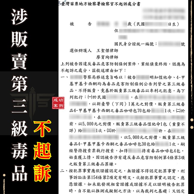 2024/10/29案件說明: 本案將介紹一則,關於當事人遭他人指控有販賣咖啡包,因此被以「販賣第三級毒品」等罪嫌偵辦;所幸及時委任「專精毒品案件」的謙聖,獲「不起訴」的成