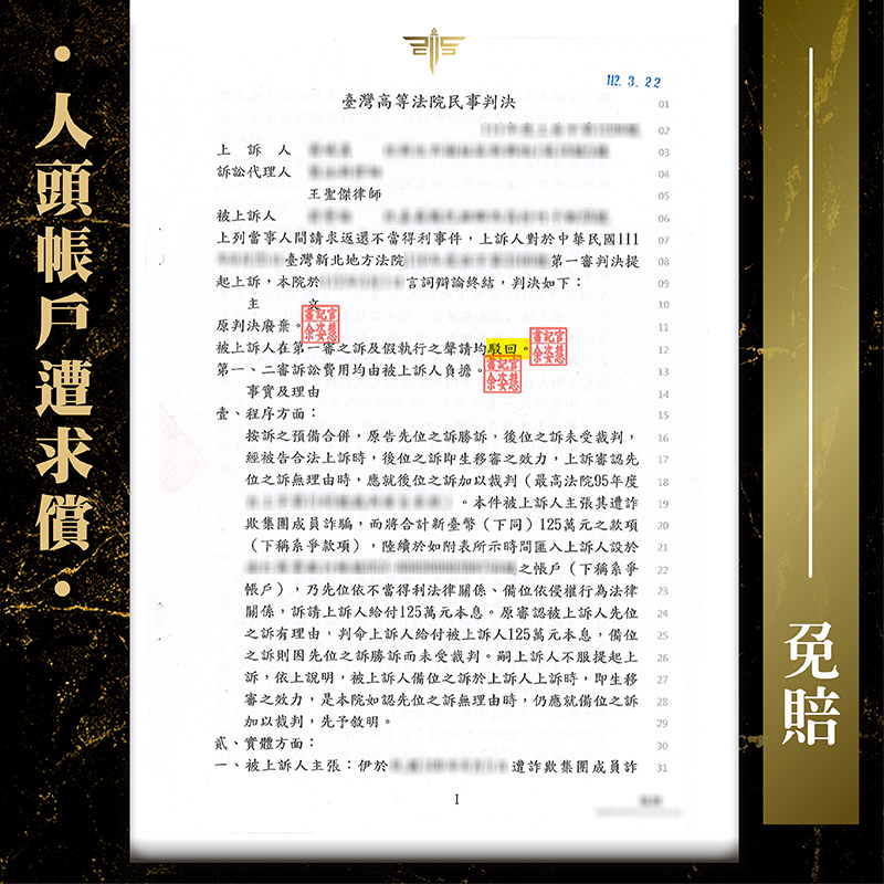 最終!成功幫當事人爭取到,「向人頭帳戶請求返還不當得利-一審原判決廢棄,被上訴人在第一審之訴及假執行聲請均駁回」,簡略的說,就是『無須賠償』,上訴結果可說是全贏!