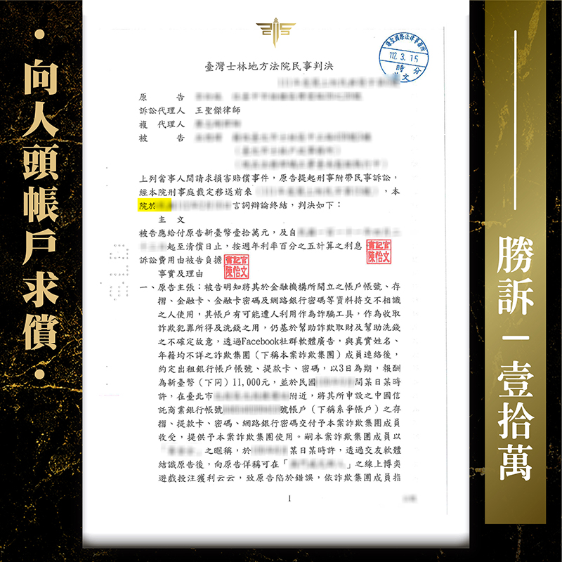 〚台北律師事務所推薦〛向人頭帳戶求償「判賠10萬元」