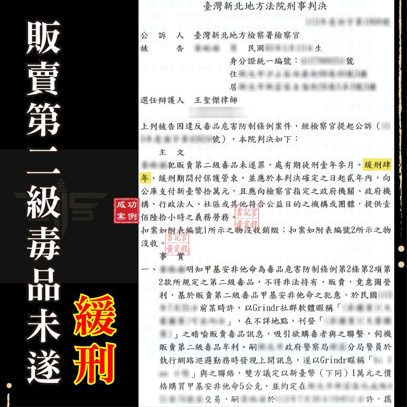 【新北毒品案律師推薦!新北毒品案件專門處理律師】遭控販賣第二級毒品,經專業律師辯護,成功爭取到緩刑