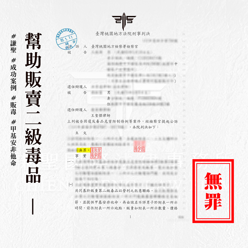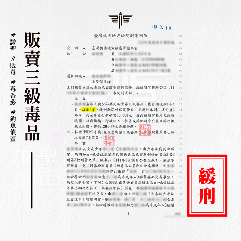 2024/03/20案情過程: 本案將介紹一則關於當事人在網路上販賣三級毒品遭警察釣魚,在一審階段找謙聖處理,拿到【緩刑】宣告的成功案例。