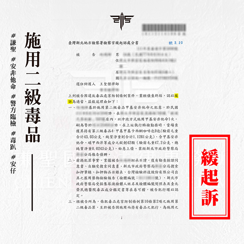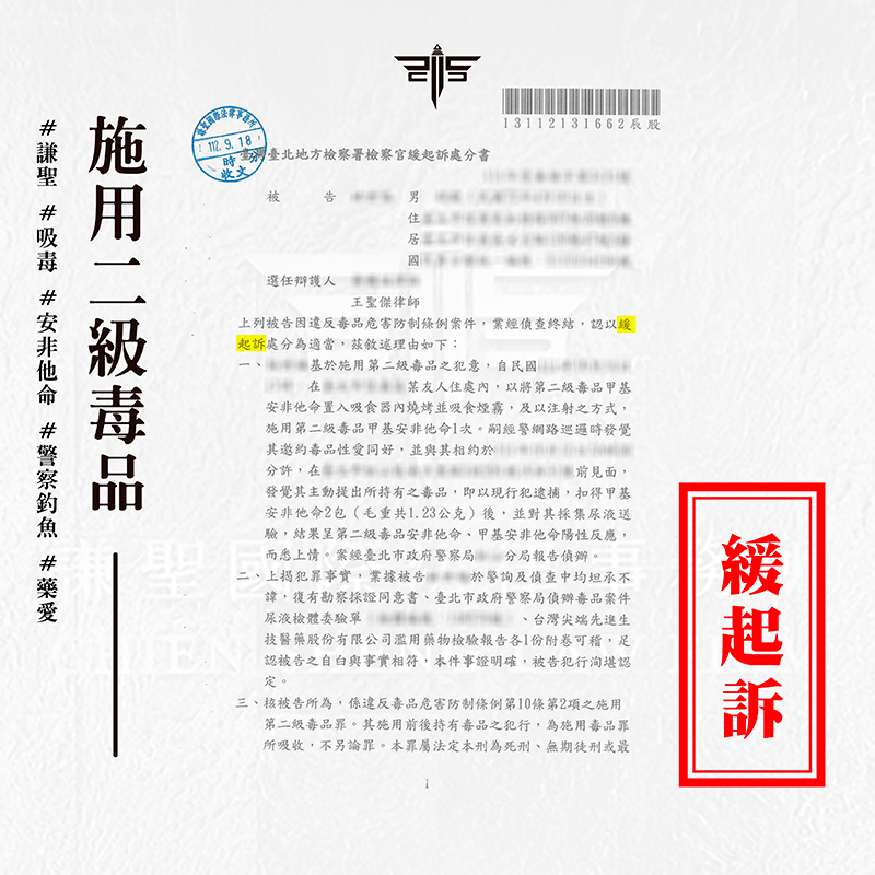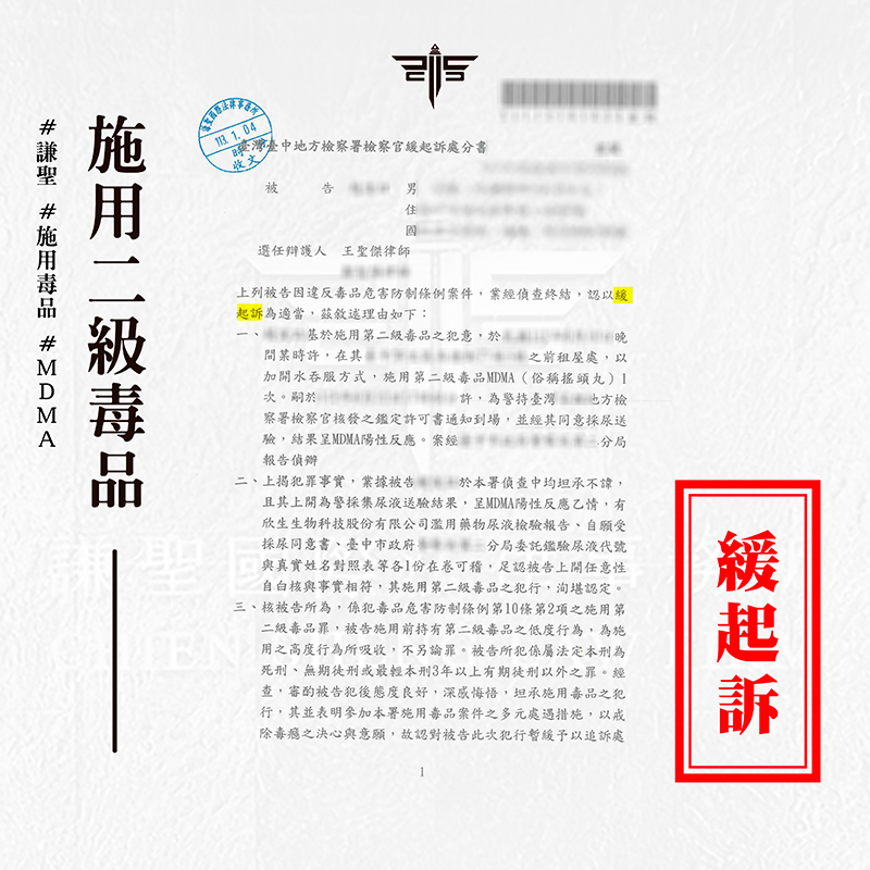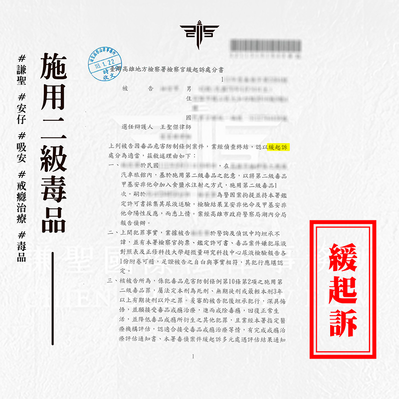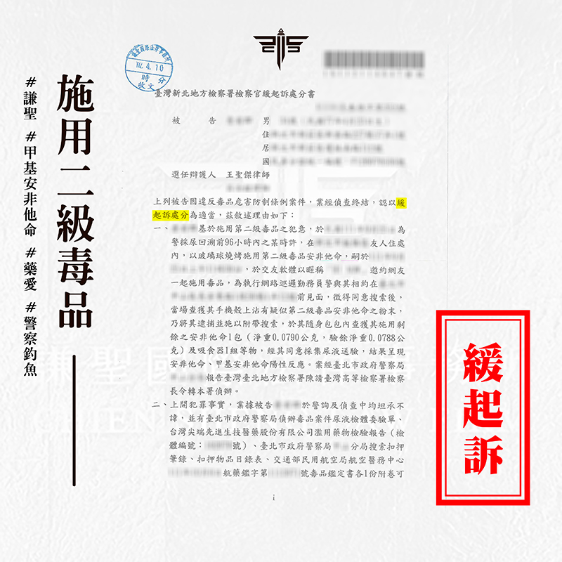 2024/03/18案情過程: 本案將介紹一則關於當事人邀約網友一同施用毒品,沒想到竟遇上警察釣魚,被帶回警局驗尿,驗出二級毒品陽性反應,及時找謙聖處理,拿到【緩起訴】的成