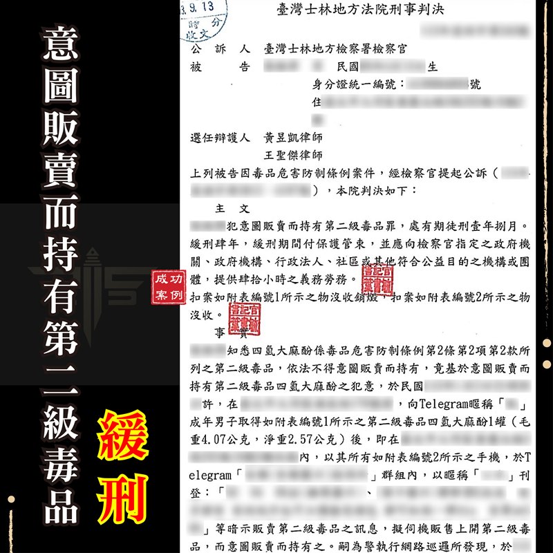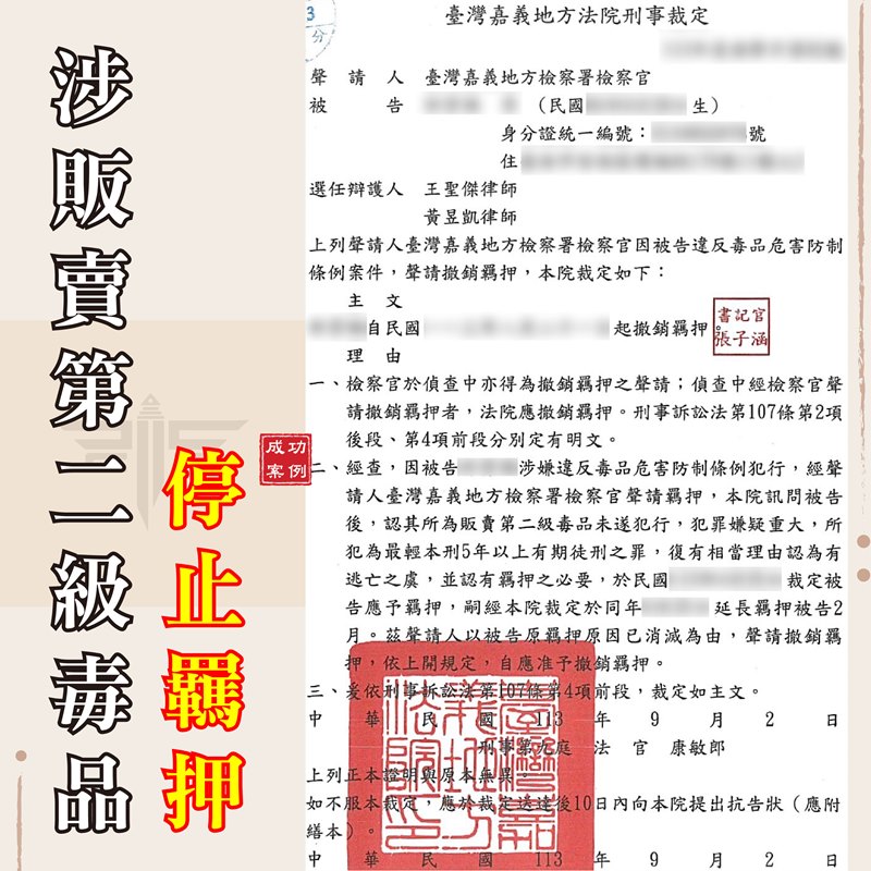 2024/11/11案件說明: 本案將介紹一則,關於當事人突然被警衝,家中搜到多種第二級毒品,因此被以「販賣第二級毒品」等罪嫌偵辦,並遭到羈押;所幸及時委任「專精毒品案件」