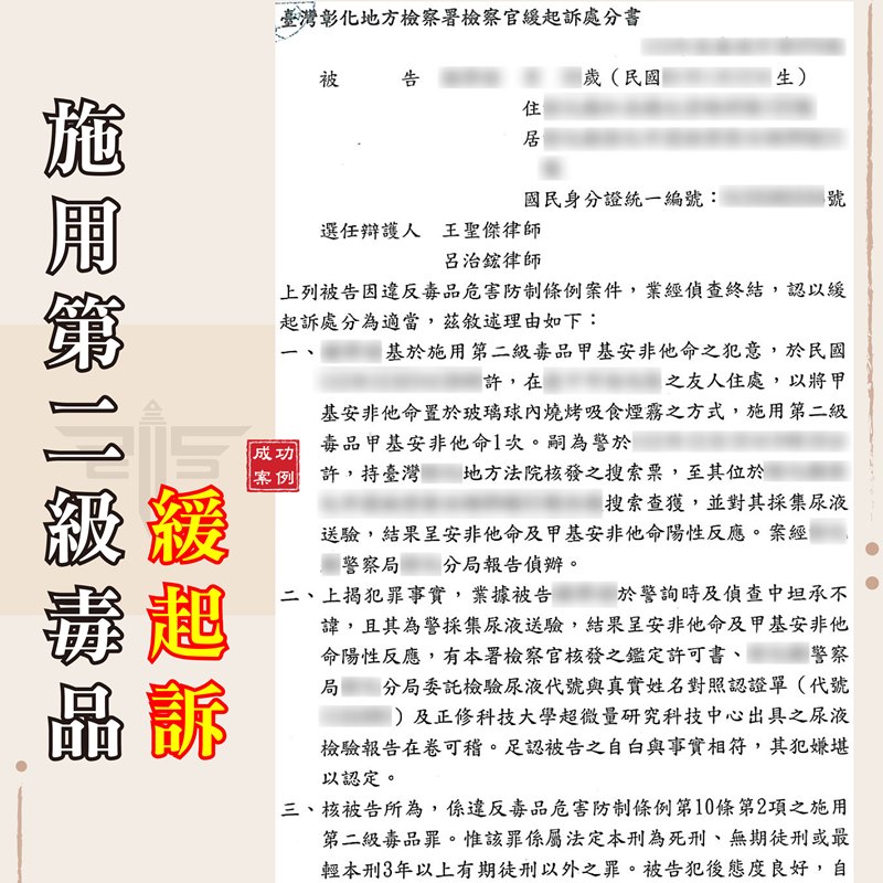 2024/11/29案情過程: 本案將介紹一則,關於當事人曾在友人家吸食過安非他命,某日突被警衝,因此被以「施用第二級毒品」等罪嫌偵辦;所幸及時委任「專精毒品案件」的謙聖,
